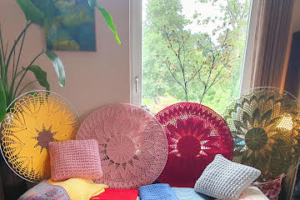 Inmiddels is Mieke al een paar jaar met pensioen. En wat doe je dan met je vrije tijd? Een hobby van vele jaren geleden kwam weer naar boven: haken! Zij stamt uit de tijd (jaren ’70) van de gehaakte gordijntjes en spreien en nog zoveel andere dingen Sommigen van jullie zullen zich die tijd zeker nog herinneren. Maar na een aantal jaar flink doorhaken, werd de stapel steeds hoger. Mede door de komst van 2 achterkleinkinderen (meisje en jongetje) werd er natuurlijk een roze en een blauw dekentje gehaakt. Tot gevolg dat zij de laatste tijd dekentjes haakt in verschillende maten/kleuren en patronen. Nu wordt het tijd anderen blij te maken met haar creaties. Dus tot 6 september!